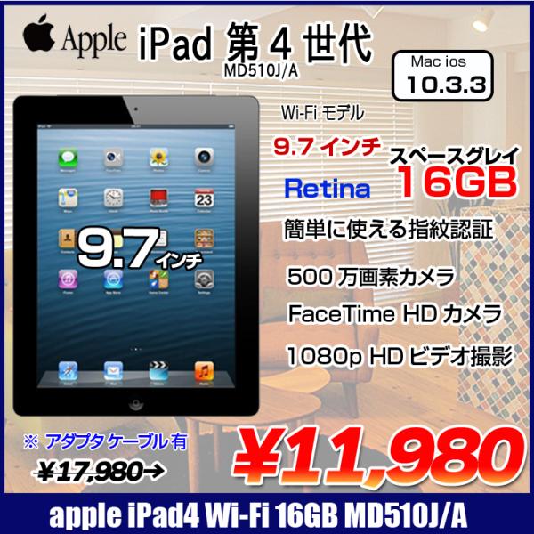 - タブレット > iPad本体 > 未開封 iPad 第4世代 シュリンク付 16gb MD510J/A ブラック iPad Apple iPad4 第4世代 MD510J/A Retina Wi-Fi 16GB [ A6X 1.4GHz
