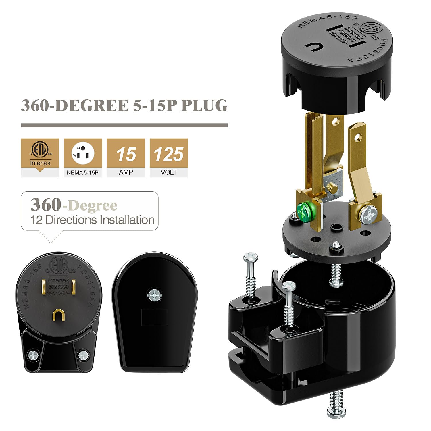 DeliciousTaylormade QUADFACE NKT×AC Right Angle Nema 5-15P 15A 125V AC Plug, ETL Listed Easy Assembly